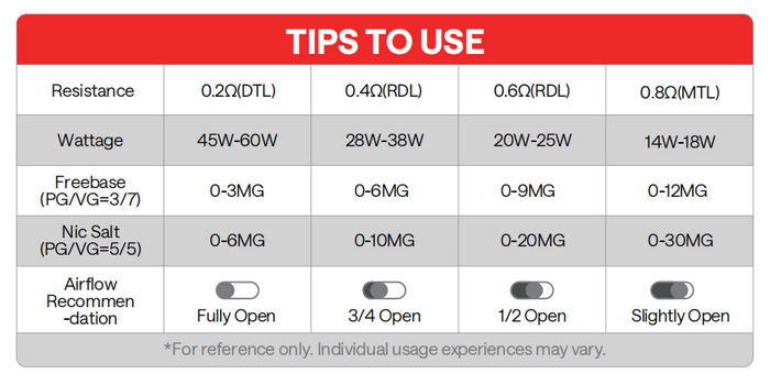 VPrime 0.4 Ω: قابل استفاده با توان 28 و 38 وات، برای مکش باز، ضربه متوسط و سرعت متوسط VG. طعمهای برجسته و مصرف متوسط مایع الکترونیکی.
